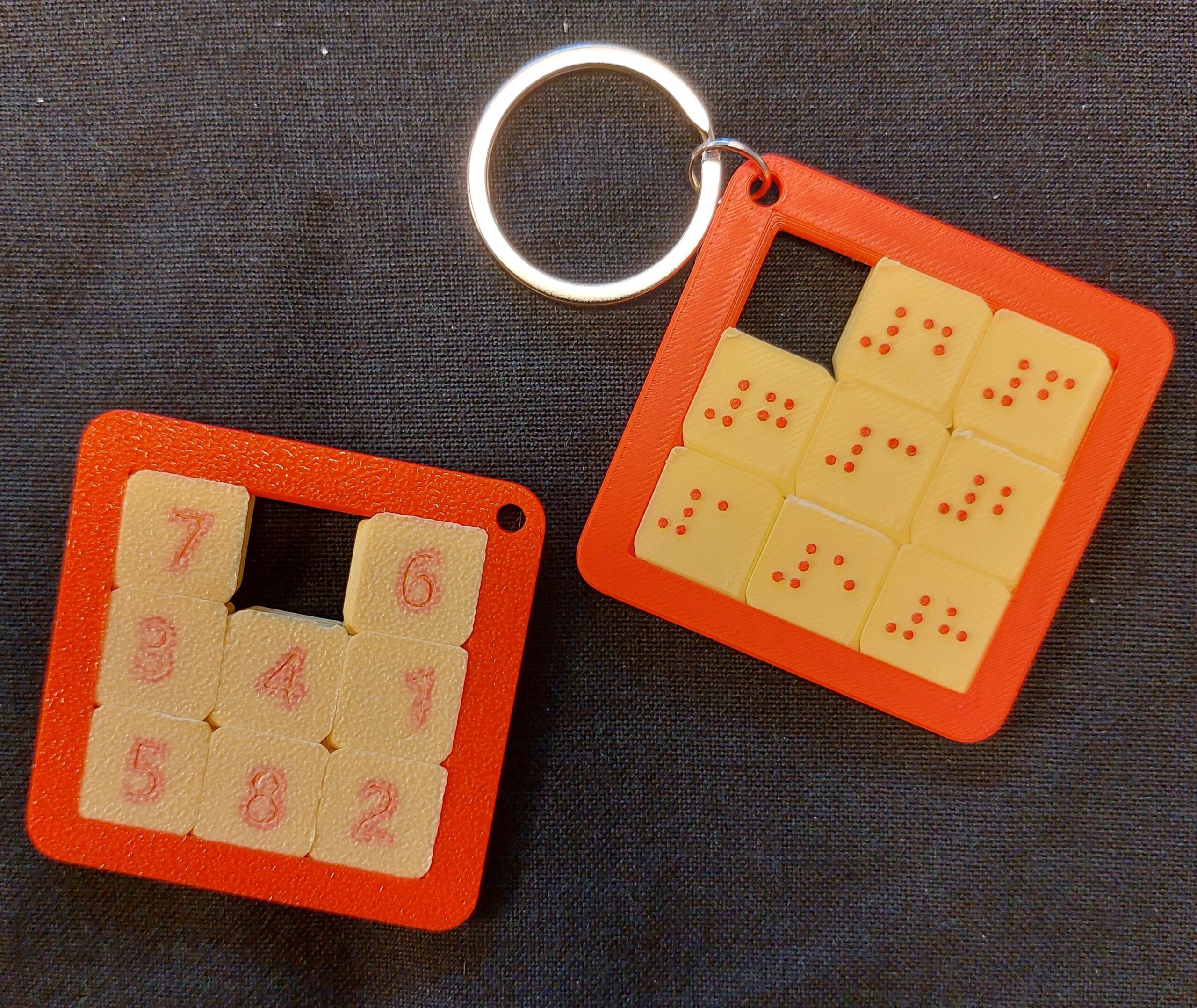 A 3D nyomtatással készült kis tili-toli 1-től 8-ig tanítja a Braille számokat. Egyik oldalán síkírással gravírozva, másik oldalon pontírással vannak a számok nyomtatva. Méretei: 4,5 cm* 4,5 cm