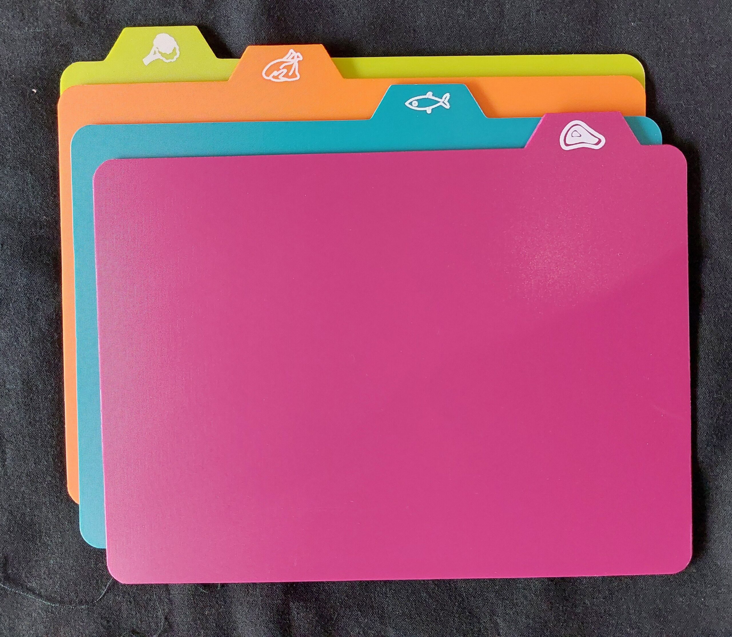 4 különböző színű vágólap. Felső szélén élelmiszer szimbólumot ábrázoló fülecskével megjelölve, mindegyik vágólapon más-más helyen. Anyaga:műanyag. Méretei vágólaponként: 20,5 cm széles; 28 cm hosszú; 22 cm teljes szélesség.