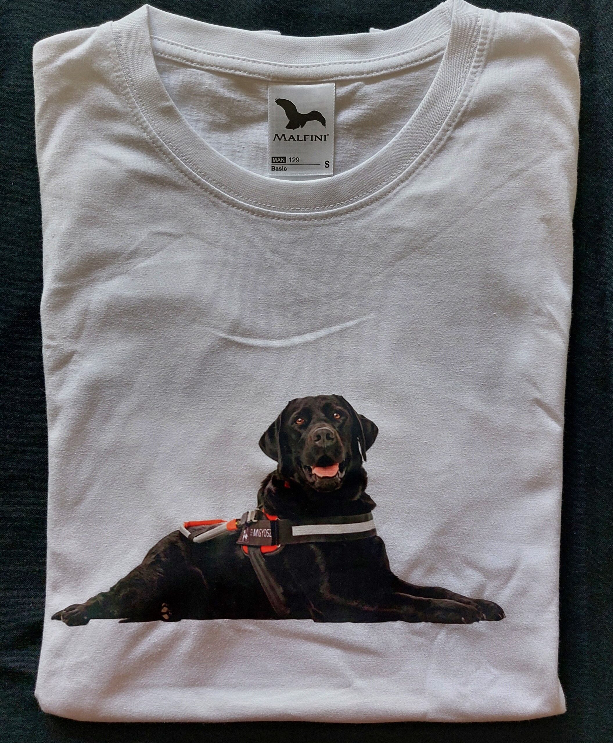 Fehér színű póló nyomott, színes fotómintával. Az elején középen egy fekete Labrador vakvezetőkutya fekszik MVGYOSZ hámban. Ő Bucky.