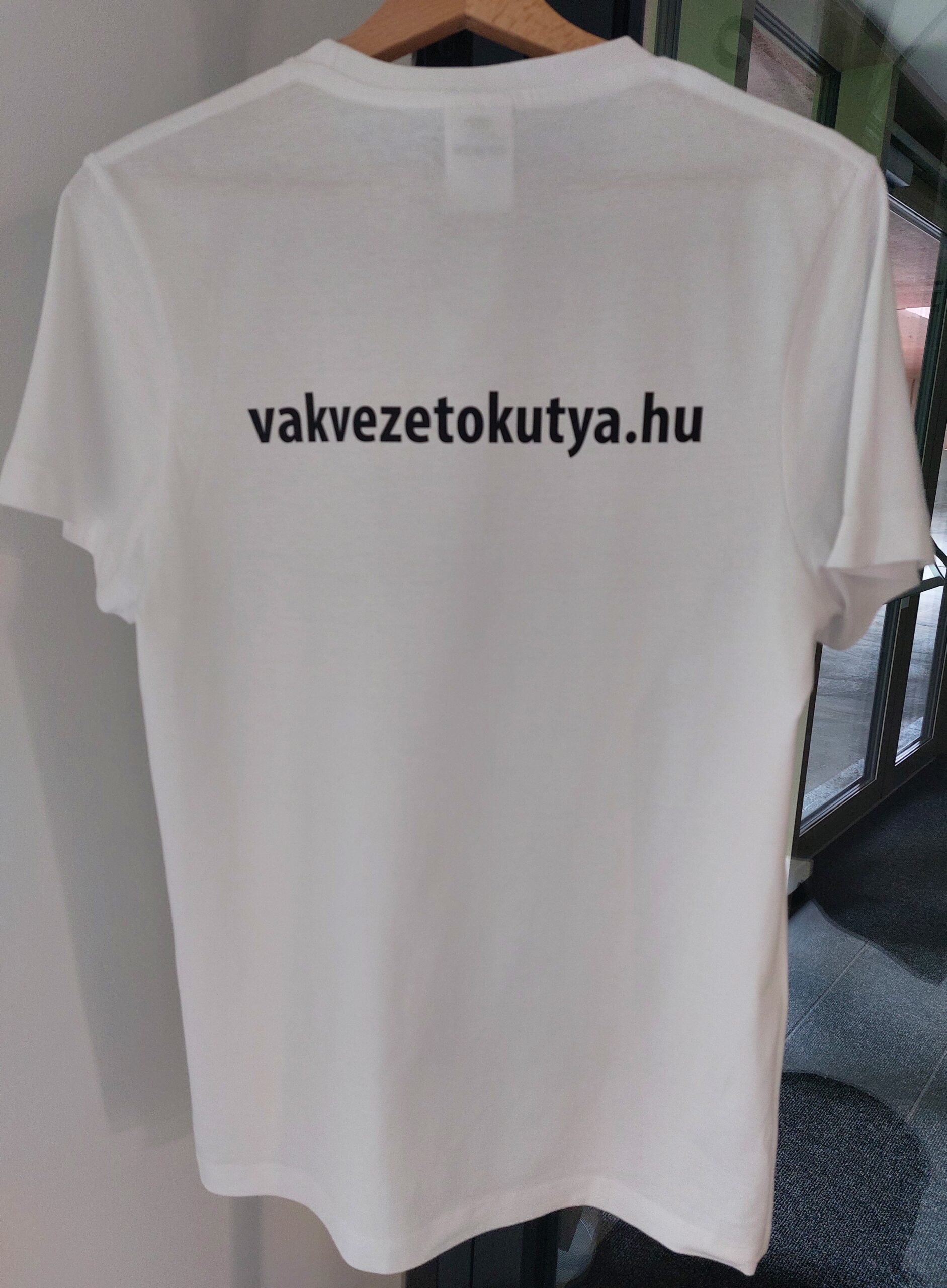 A hátán a vakvezetokutya.hu felirat olvasható fekete betűkkel.